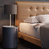 Bed with a beechwood frame. Headboard upholstered in leather with a plain stitch. Black beechwood legs. Black metal corner connectors.