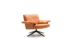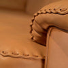 Classic armchair with hand-crafted strap stitching and black coated base.